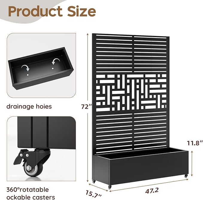 - Easy to move and superior drainage system: This vertical garden planter with trellis features 360° swivel casters, allowing you to effortlessly move the raised planter box anywhere. The privacy planters for patio also features an 11.8-inch deep planting bed with drainage holes, providing ample space for plant roots to thrive while preventing waterlogging and root rot. The planter box with trellis combine decorative appeal with practical functionality.