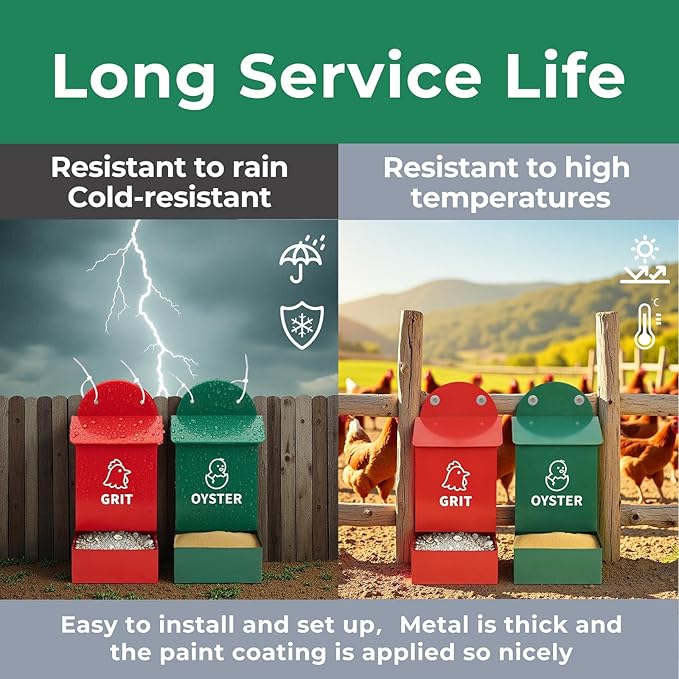 - DUAL COMPARTMENTS – PREVENT FEED MIXING: Keep chicken grit and oyster shell separate for optimal digestion and stronger eggshells. The clear color-coded design (red for grit, green for oyster) makes feeding accurate and effortless for backyard poultry owners.