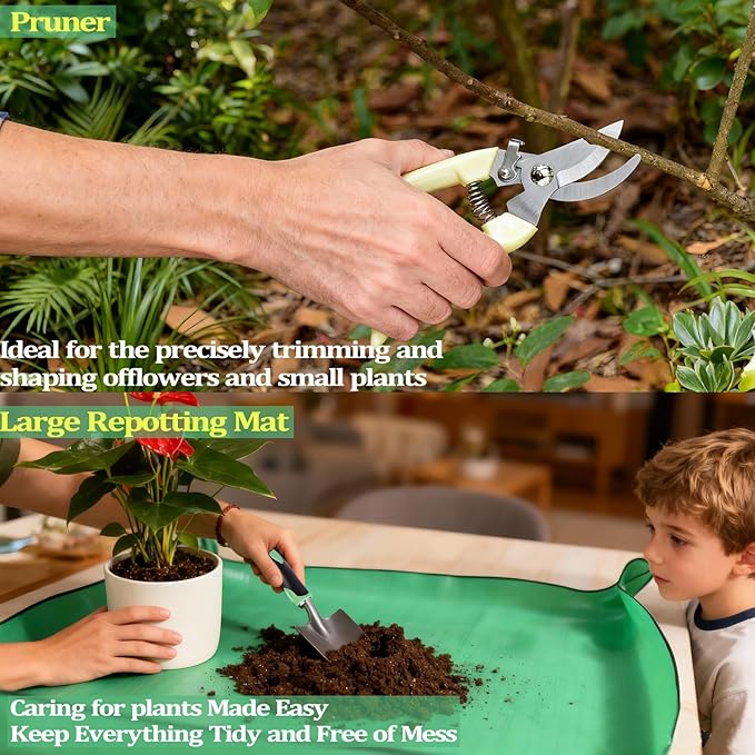 - 【Enhanced Comfort & Cleanliness】Make messy tasks tidy and hard tasks easy. The included kneeling pad cushions your knees during planting and weeding, while the large repotting mat keeps soil contained and makes cleanup a breeze. The durable gardening gloves offer essential protection for your hands.