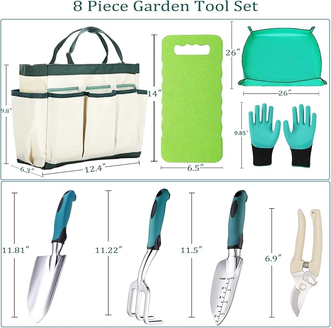 - 【All-in-One Gardening Kit】Skip buying single tools! The garden tool set includes garden trowel, hand rake, Transplanter, pruning shears, plant repotting mat, kneeling pad, a pair of gloves and a gardening bag, which meets almost all the tool needs for daily gardening maintenance, working in your exclusive garden at any time.