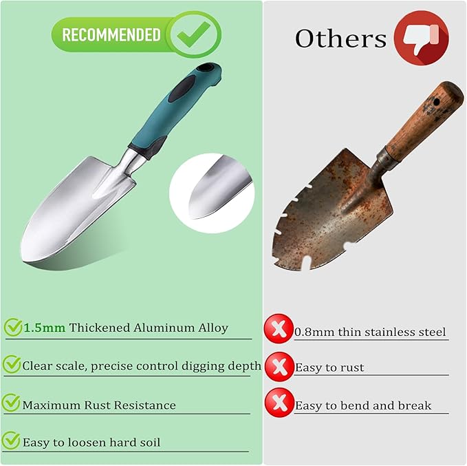 - 【Durable & Rust-Proof Aluminum Tools】Enjoy tools built to last. Our Gardening tool set is made of high-quality aluminum alloy, The garden trowel, hand rake, and transplanter are crafted from heavy-duty aluminum alloy, making them exceptionally strong yet lightweight. Their rust-proof nature ensures they withstand the elements and remain reliable season after season, providing excellent value for your money.