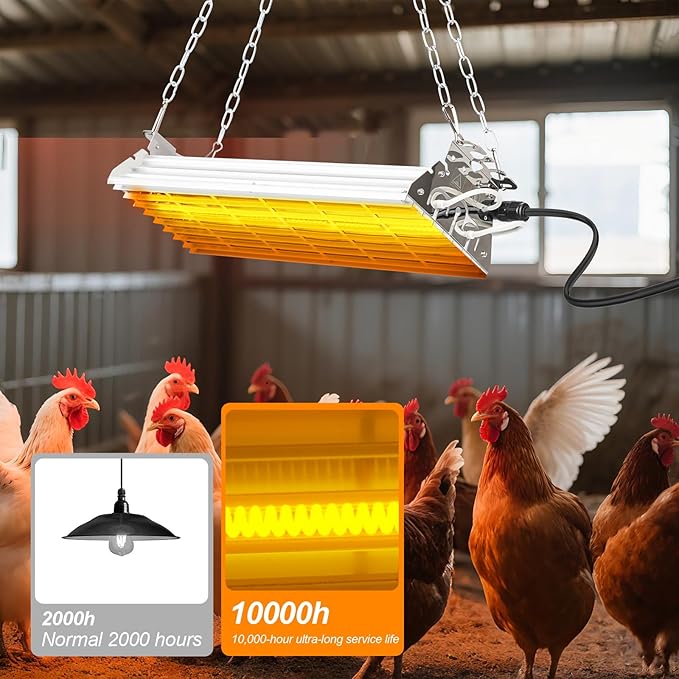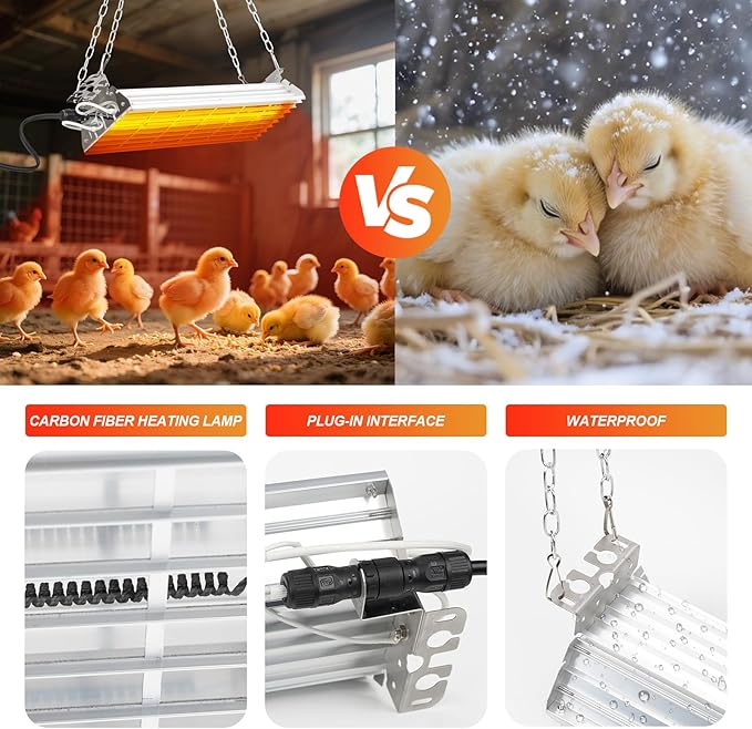 - 【Easy to Install & Use】The packge includes: chainx2, Carbon Fiber bulp x 1, lamp cover x1.Our chicken coop heater has two metal hanging wire connected to a hook, no need to drill holes on the wall, it can be easily hung using the hook.And then all had to do was plug it in and flip the switch on for it to work.