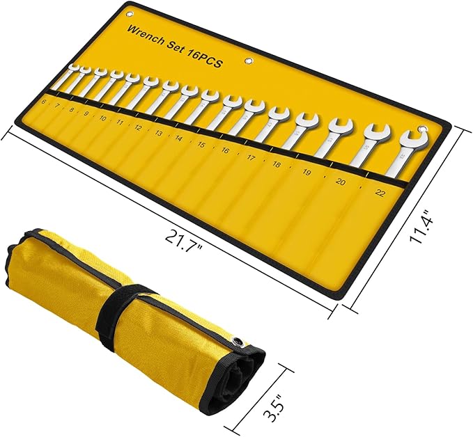 - This wrenches set contains 16 ratcheting spanner wrench in sizes 6/7/8/9/10/11/12/13/14/15/16/17/18/19/20/22mm, including a special yellow storage bag (21.7x11.4inch), with an overall weight of 2.8kg, light weight and portable.