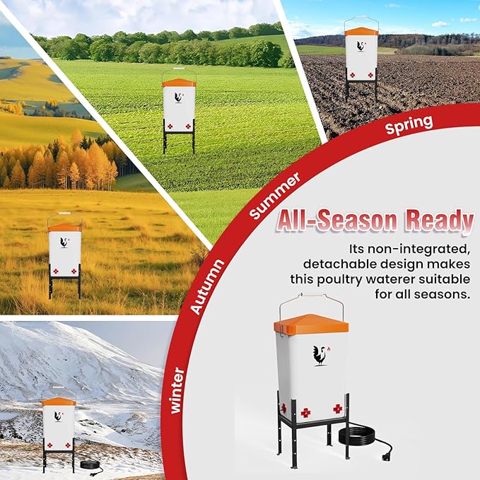 - Durable Year-Round Poultry Water Heater: Whether you’re using it as a heated chicken drinker in winter or simply as a covered poultry waterer in summer, this chicken heated drinker ensures fresh water in every season. It combines durability with function, giving you peace of mind that your chicken water heater will work no matter the weather