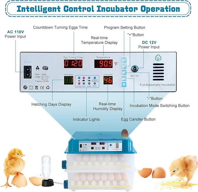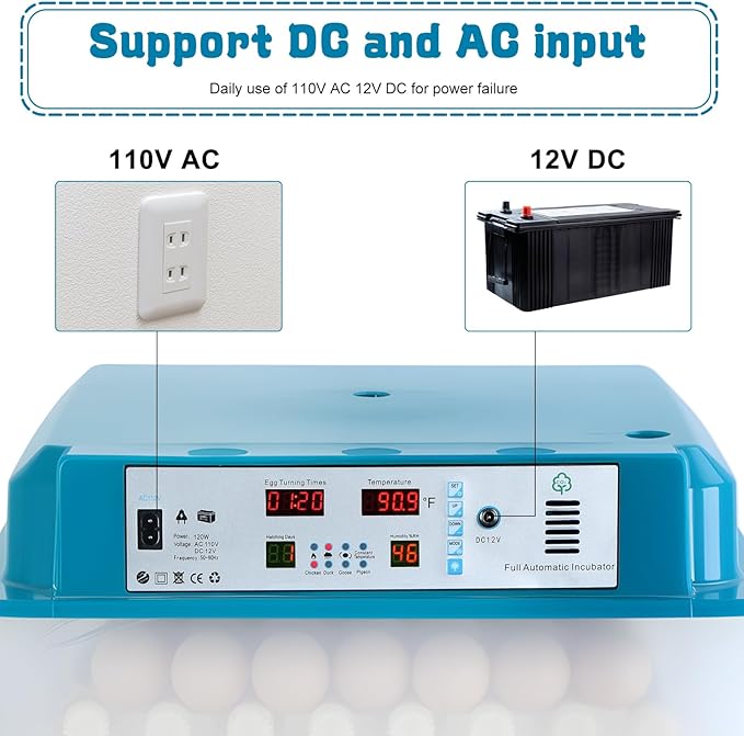 - 4. **Reliable Dual Power Supply**: Usually 110V household power supply is used. Don't worry about power outage. It supports 12V battery input (you need to buy a suitable battery yourself), and use it when power outages. Dual power supply can ensure the normal operation of the hatcher.