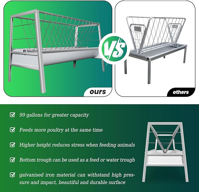 - 99 Gallon Large Capacity: This hay feeder boasts an impressive 99-gallon total capacity, with 66 gallons dedicated to hay and 33 gallons for grain or water. The double-trough design allows 12-18 goats to feed simultaneously, while the wide opening makes refilling quick and hassle-free.