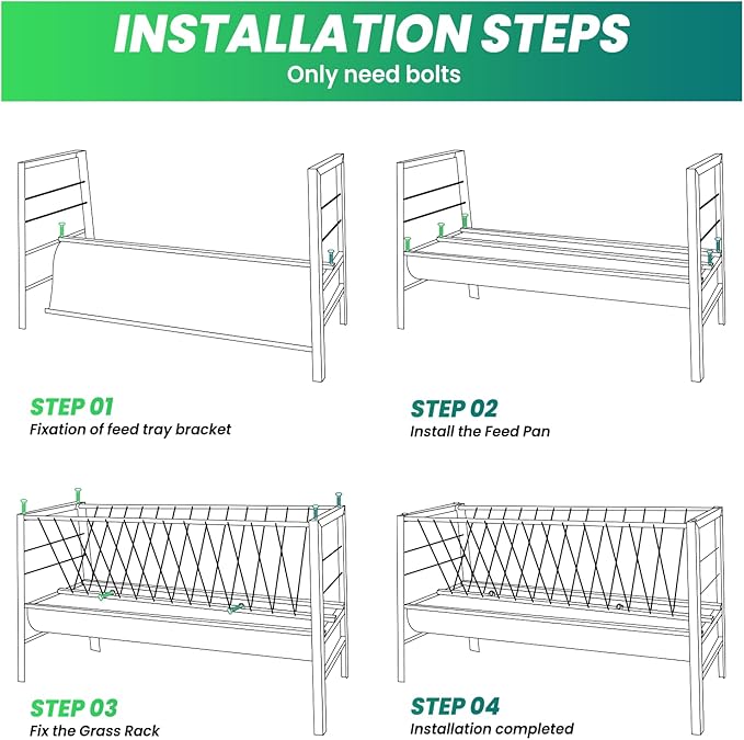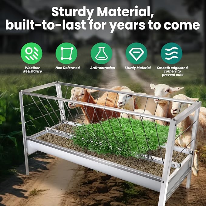 - Simple Setup: All parts of the goat hay feeder come pre-drilled; assemble in under 15 minutes with included bolts (a basic wrench works). At 43.5 lbs, moving this hay rack is easy.