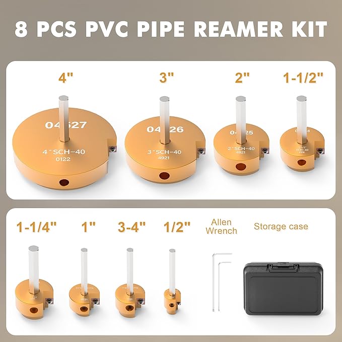 - Wide Application: The pvc pipe reamer kit offers eight sizes ranging from 1/2 inch to 4 inches, catering to the needs of different pipe diameters. Whether it's ventilation pipes, drainage pipes, or water pipes, it can handle them all, suitable for various pipe types such as PVC, PP, and PE, making it an essential tool for pipe repair and installation.