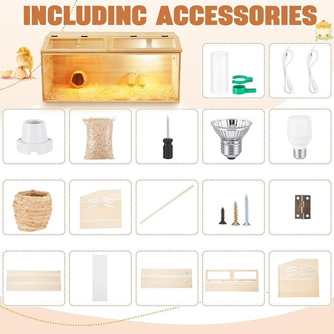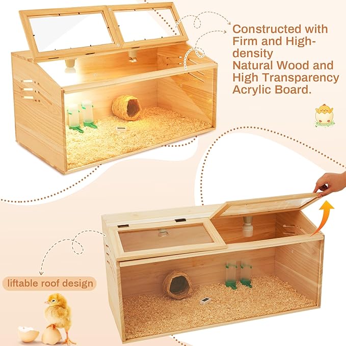 - Sliding Door and Transparent Skylight: our sliding door design makes it easy to clean the chicken coop; Removable table leg design is also available, giving you more flexibility in choosing the placement, The Wooden Chicken Brooder Box features transparent acrylic panels on the front and top, allowing easy observation and interaction with chicks