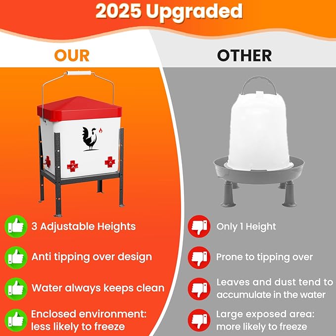 - Thermostatically Controlled: Experience worry-free winters with our heated chicken waterer! The built-in thermostat automatically maintains water at an ideal, ice-free temperature range (Heating Plate Temperature Range: 130–149°F); Its innovative split design features a separate chicken water heater base that promotes water circulation, ensuring a steady supply of fresh, clean heated water for chickens; This heated poultry waterer for chickens is the ultimate solution for your chicken coop accessories to prevent freezing