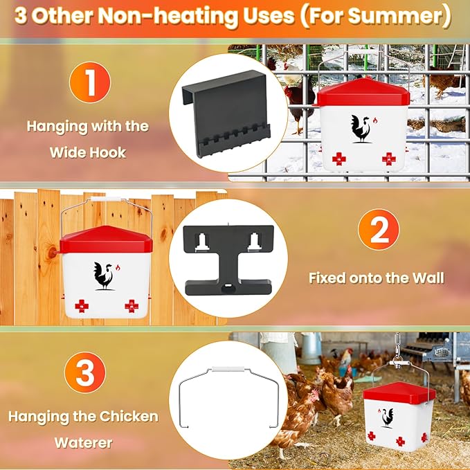 - Year-Round Chicken Coop Accessory: In winter, use it as a complete heated chicken waterer for winter with the power cord plugged in; In summer, detach the heating base and use the bucket alone; This heated chicken waterer top fill comes with a full installation kit, including wide hanging hook and mounting accessory, allowing you to securely hang it on wire fencing or mount it onto the wall
