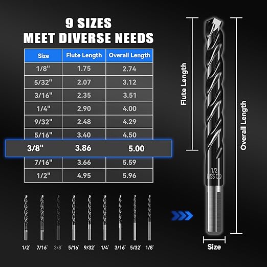 - 5pcs 3/8" Cobalt Drill Bits Set - Includes 5pcs 3/8" Titanium aluminum nitride coated Metal Drill Bits with Index Storage Case.