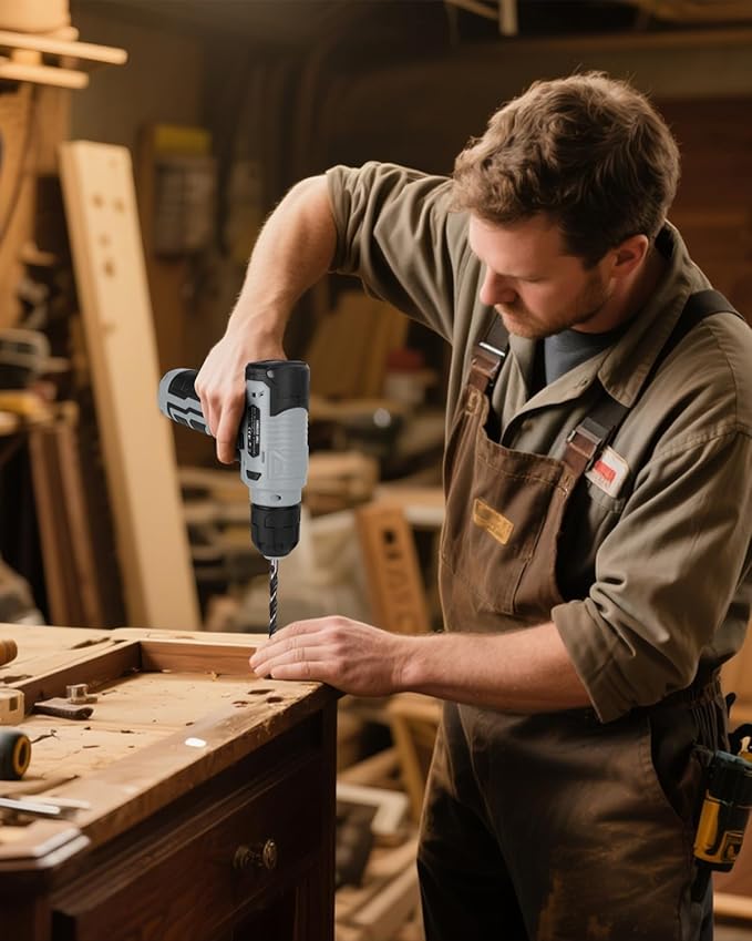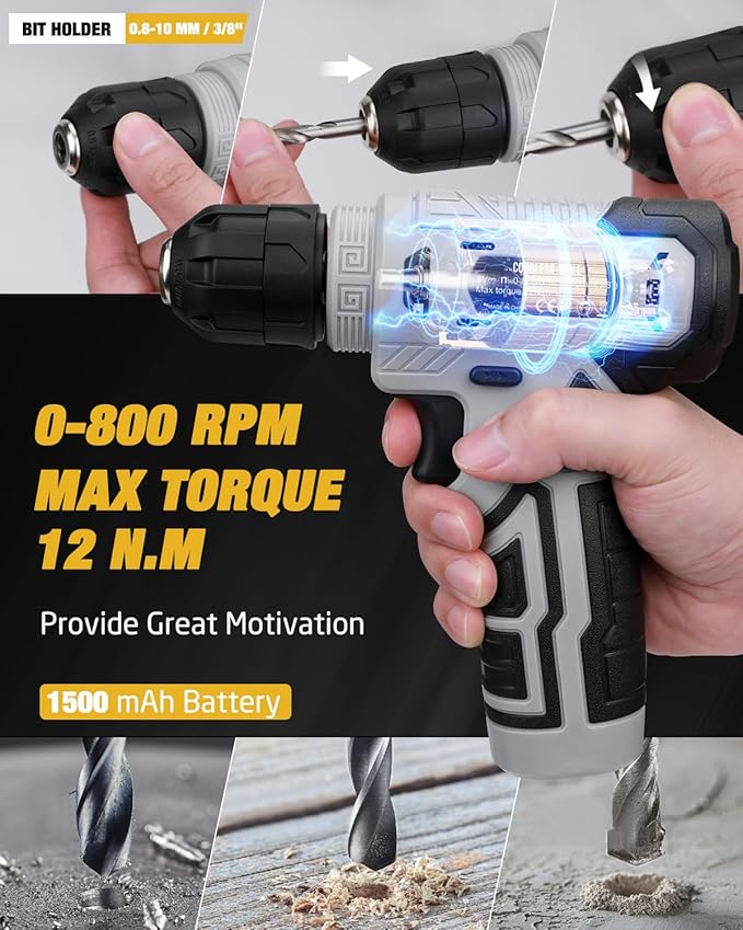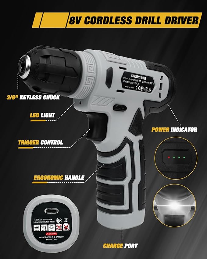 - 8V Power Cordless Drill with LED: Featuring a compact, ergonomic design, this drill boasts a non-slip grip for secure handling. Its lightweight build enhances maneuverability, while adjustable speed settings (up to 800 RPM no-load speed) adapt to varied applications. The integrated LED light ensures visibility in low-light conditions.
