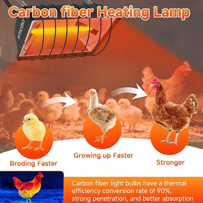 - Long-Lasting & Energy Efficient: The first to feature carbon fiber bulbs for a Chicken Coop Heating Lamp. Each carbon fiber bulb lasts up to 12,000 hours (with 1.5 years of warranty). One carbon fiber bulb equals the lifespan of five traditional infrared bulbs. The lamp heats up in just 1–2 seconds, providing an even heat coverage of up to 5,000 cm² for faster and more uniform warmth absorption. With a 90% heat conversion efficiency, it’s three times more efficient than regular bulbs, helping reduce energy consumption