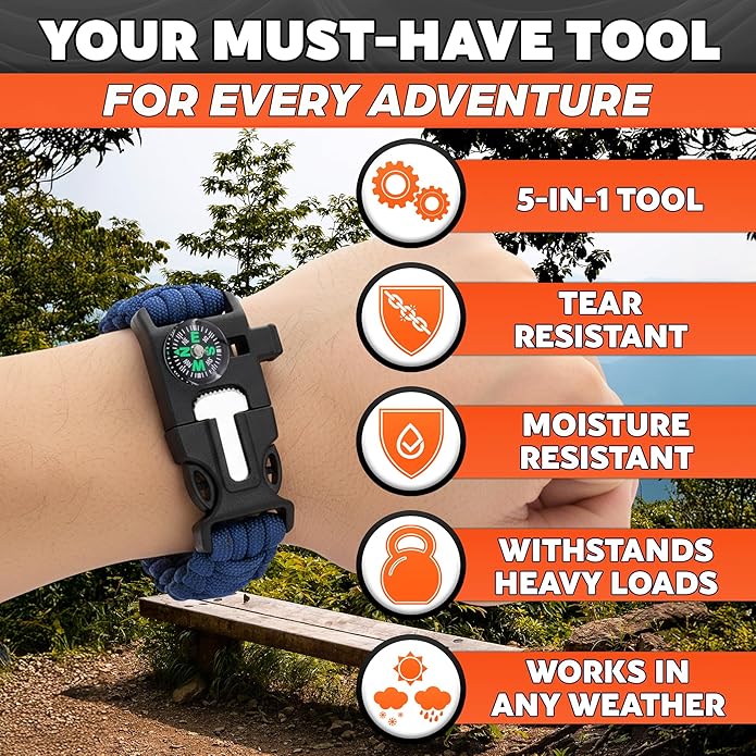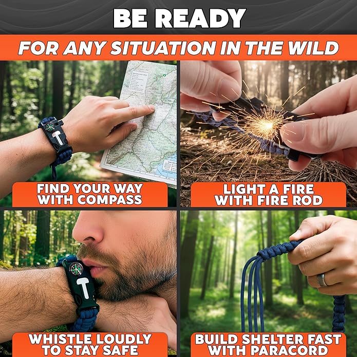 - 5-in-1 Hiking Supplies: Each emergency bracelet combines a durable cord, a flint fire starter with scraper, a wrist compass, & whistle, giving you reliable survival gear and supplies always at hand