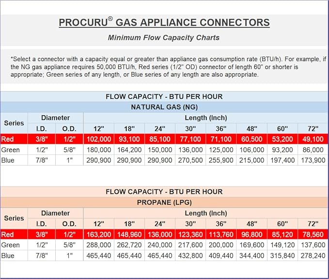 - Designed for gas dryer, water heater, grills, and other natural and propane (LP) gas appliances (see Capacity Chart)