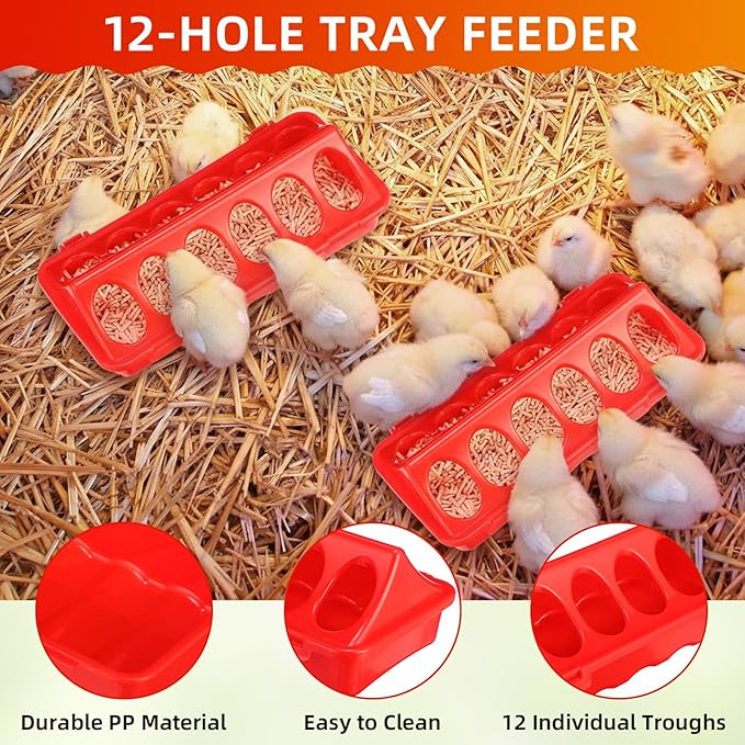 - 12-Hole Tray Feeder: each feeder features 12 individual troughs, allowing you to feed multiple birds simultaneously; Efficient food distribution not only reduces food waste and competition among birds, but also ensures your birds stay healthy and well-fed; Suitable for chickens, quail, pigeons, and other small birds