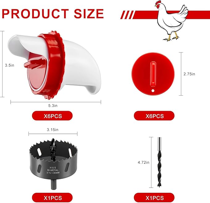 - 6 PACK CHICKEN FEEDER PORT KIT – Complete set with 6 chicken feeder ports and installation hole saw. Turns buckets, bins, or barrels into an automatic chicken feeder for easy feeding and less daily work