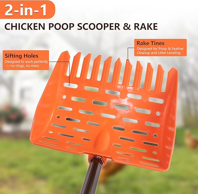 - 2-in-1 Chicken Poop Scooper & Sifter – Clean in One Step Gather droppings and debris with the durable rake, then sift clean bedding (sand, coconut fiber, Sweet PDZ, coffee grounds) from waste using the precision mesh. Save time, reduce bedding waste, and keep your coop fresher.