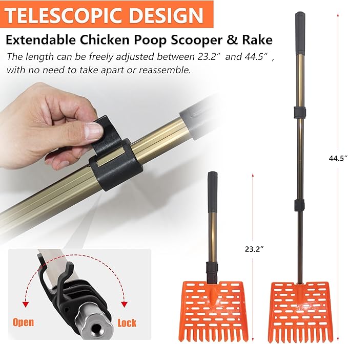 - Telescopic Aluminum Handle – 23.2" to 44.5" Adjustable Extend the handle to reach high coops or tight spots, then collapse it down for compact storage. The lightweight yet sturdy aluminum pole is easy to maneuver and fits both adults and kids.