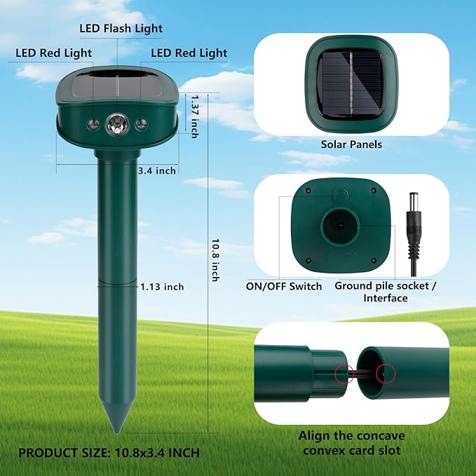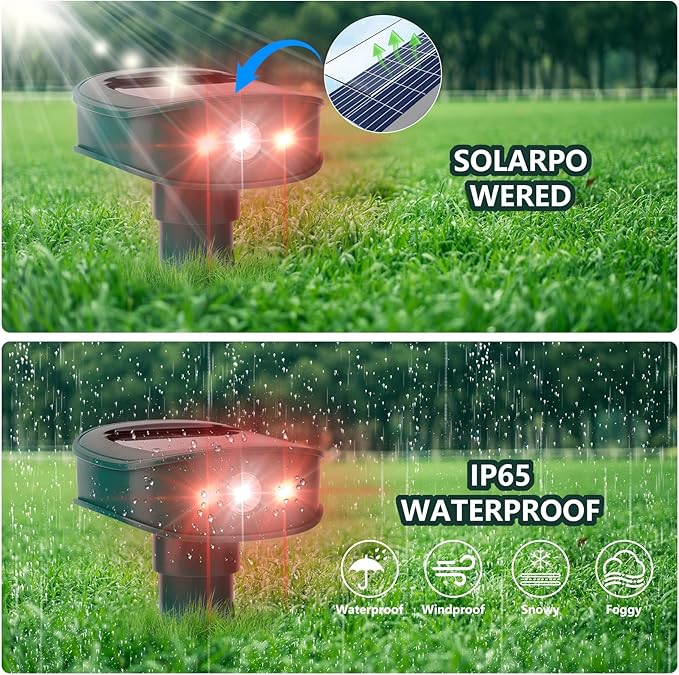 - Safe & Human Design:You can simply insert the animal repeller into the ground or hang up where there is plenty of sun light and switch it on, which is perfect for yard, patio, garage, attics, porches, boats, garden, farm, pond, etc. Besides, it is mini enough for you to take it to outdoor, such as camping.