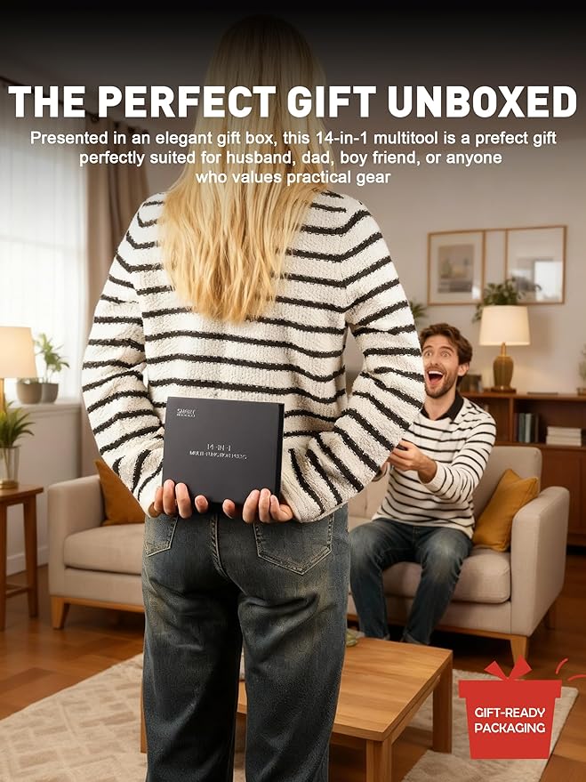 - Premium Gift Box & Sheath for an Unforgettable Unboxing: This multitool arrives in a premium gift box w/ a durable nylon sheath, ensuring secure storage and a memorable unboxing. The sturdy belt clip enables easy portability, making it an ideal ready-to-gift choice for men, DIYers, and outdoor adventurers on any occasion