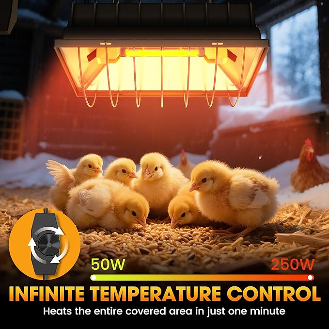 - STEPLESS TEMPERATURE CONTROL: Unlike other chicken coop heaters with only 2 settings, our infrared heat lamp supports stepless adjustment from 50W to 250W. This allows you to fine-tune the temperature to match your poultry's needs
