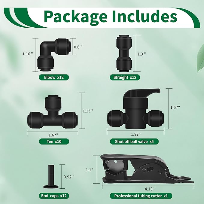 - 【Complete 1/4" OD Fitting Set for Drip Irrigation】 This comprehensive 52-piece kit includes 12 Couplings, 10 Tees, 12 Elbows, 5 Shut-Off Valves, 12 Plugs, and 1 Professional Tubing Cutter. Everything you need to build, repair, or expand your 1/4" drip irrigation system efficiently.