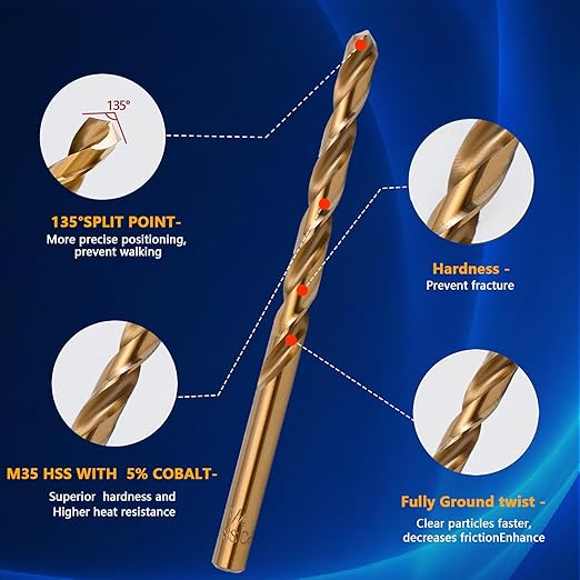 - M35 Cobalt Drill Bit: Premium High Speed Steel M35 (Cobalt 5%) offers superior heat resistance and greater hardness compared to ordinary drill bits. It can extend the tool's service life when drilling hard materials.