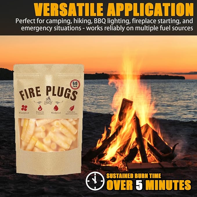 60 Pack Fire Plugs, Weatherproof Fire Starters for Emergencies, Survival, Campfires, Fire Pits, Charcoal Grill, Long Burn Time