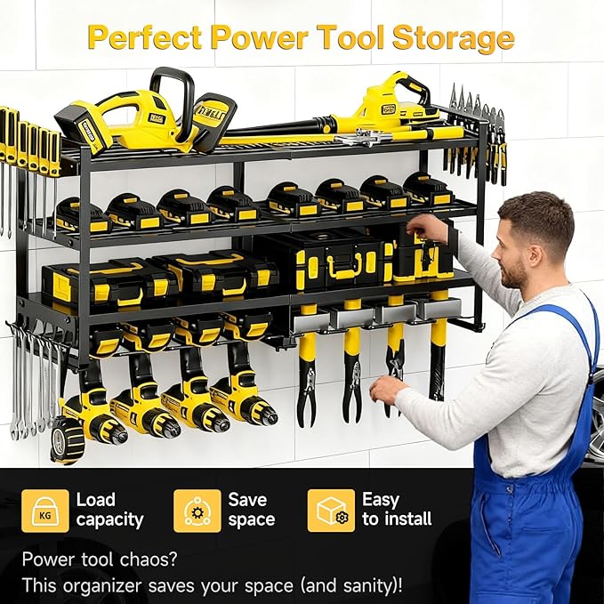 - All-in-One Organization System: Maximize your wall space with this efficient 4-tier design. It features 8 dedicated slots for cordless drills/drivers and a spacious flat shelf for storing tool batteries, chargers, circular saws, or other bulky items. The integrated charging station keeps batteries powered up and ready to go, eliminating clutter and chaos.