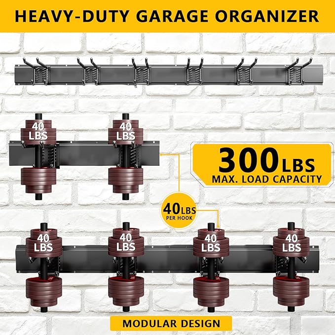 - 【Total Customization】:This 48-inch system has 6 adjustable garage wall hooks in 1 unique styles, each with a protective rubber coating for Perfectly organize your space and protect your tools.