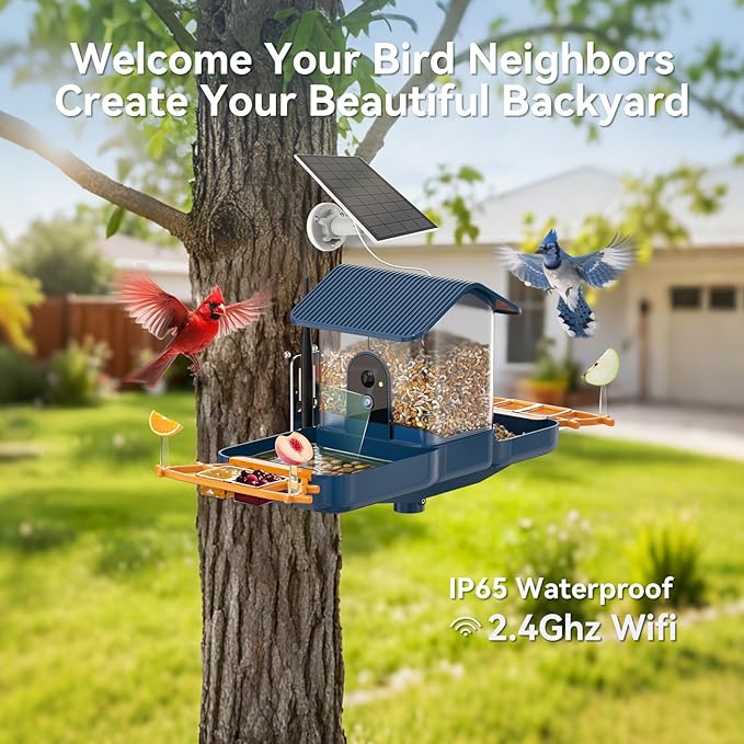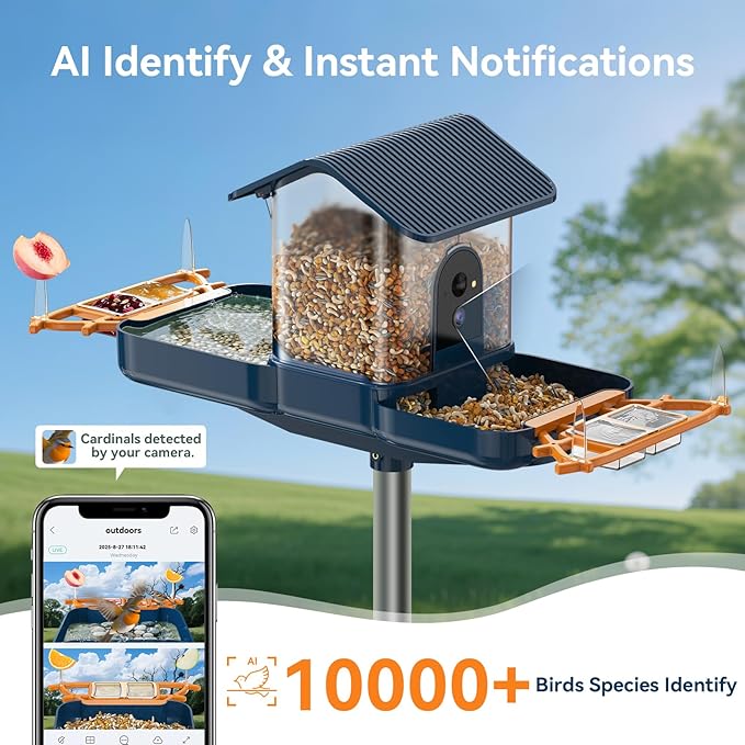 - AI IDENTIFY & REAL-TIME ALERTS- This camera bird feeder and bath with AI features. When the birds coming, the built-in AI can recognize bird species, with up to 10000+species that can be recognized, and can further provide corresponding bird knowledge, enjoying more fun of bird watching. The Instant notification function of the bird feeder camera is quite useful. When birds arrive, your mobile app will receive a prompt, inform you which bird it is, will not missing any moments