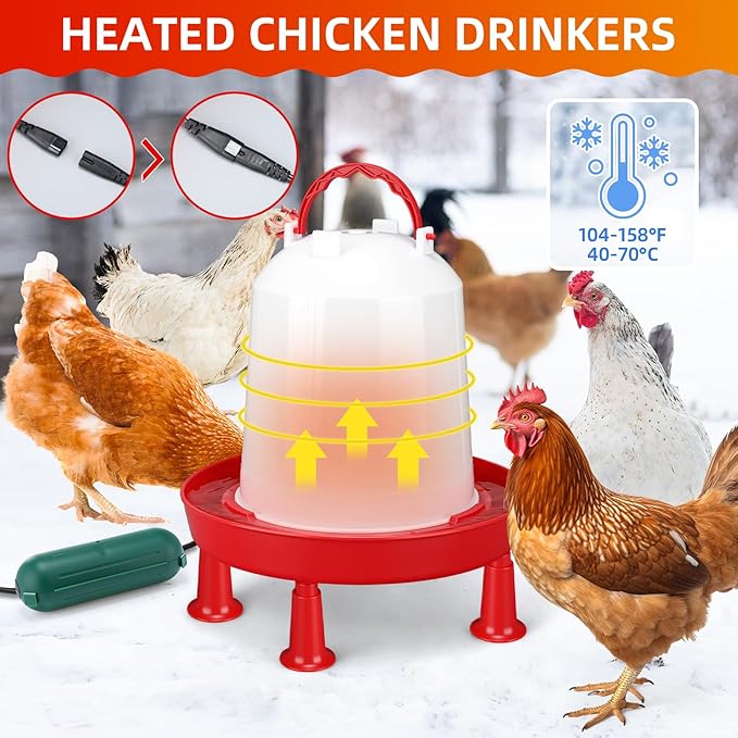 - Constant Temperature Heated Waterer for Chickens: this chicken waterer is made of plastic and features a wide mouth for easy filling and cleaning; It also features a reliable heating element that quickly melts ice, preventing it from freezing in cold weather; This heated chicken waterer maintains a consistent water temperature within a heating range of 104-158°F /40-70°C, effectively preventing overheating and burns for chickens and other small pets