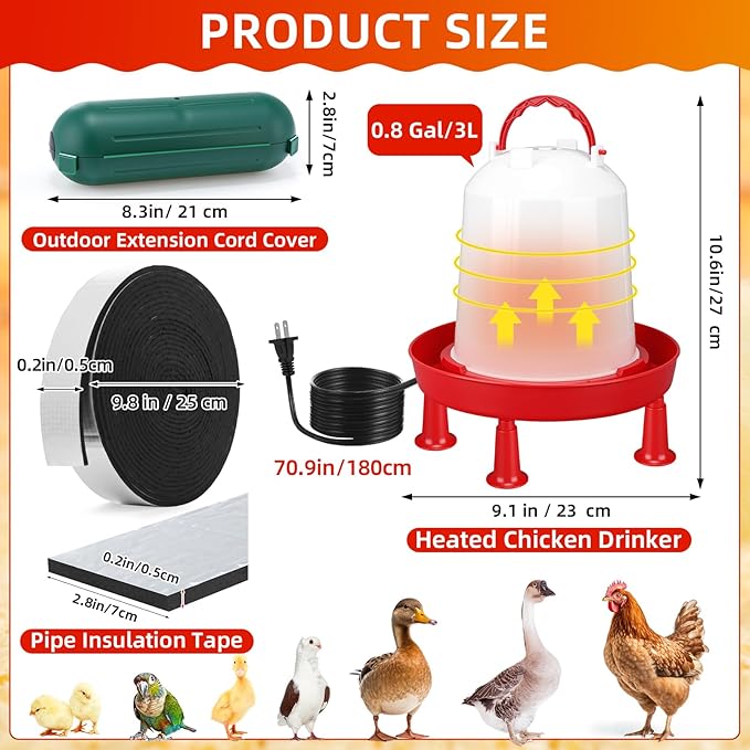- Complete Set for Winter: the package includes 1 pcs 0.8-gallon heated chicken waterer, 1 pipe insulation tape, and 1 waterproof extension cord connector; This coop heater prevents freezing in cold weather and provides warm water for your poultry; The pipe insulation tape prevents freezing and moisture in cold water pipes; The waterproof extension cord connector is compatible with AWG 12/14/16 extension cords and flat cables, making it suitable for garden light strings, holiday lights, and more