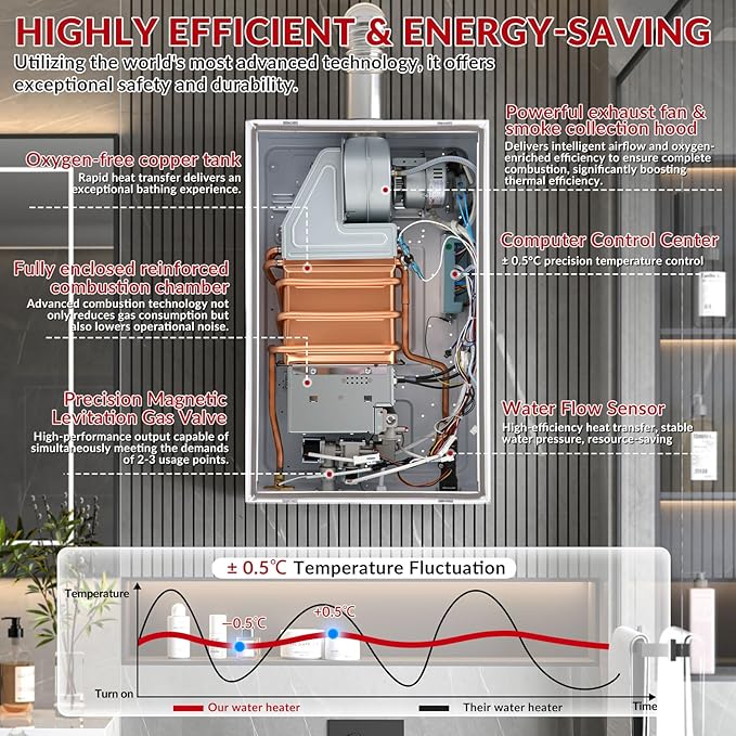 - 【Quality Material】- Our Natural Gas Water Heater has a tempered glass panel, which offers good high-temperature and corrosion resistance—ideal for humid indoor areas like bathrooms. It also comes with a built-in oxygen-free copper water tank that reduces heat loss (keeping hot water warm longer) and extends the heater’s service life. Plus, it’s equipped with an LED smart digital display, so you can easily adjust the temperature between 38°C - 75°C for different needs, like showers or washing dishes.
