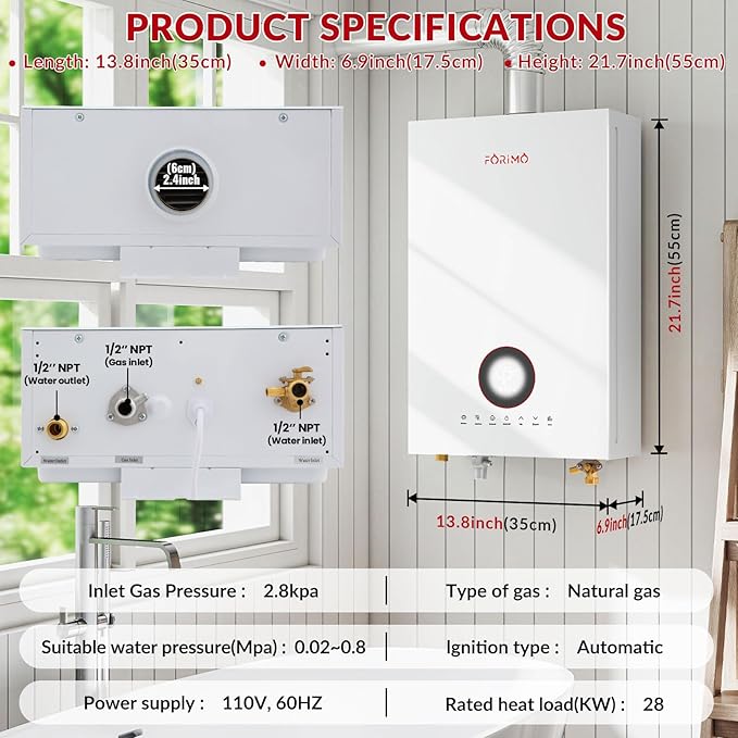 - 【Easy Assemble and Use】- This water heater is applied with standard 1/2" NPT water fittings and gas inlet, and comes with a 2.4" horizontal vent pipe for quick installation. Note: For normal operation, this product must be installed with proper ventilation and equipped with a smoke exhaust pipe.