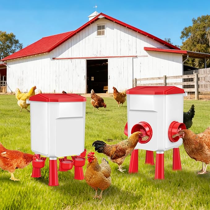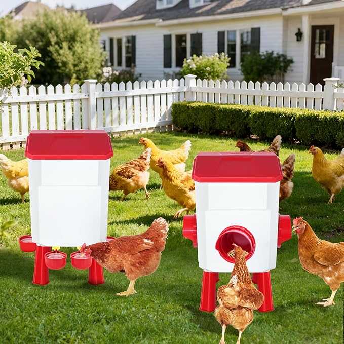 - Automatic Feeding, Cost Saving: The chicken feeder and waterer set automatically distribute food and water based on the principle of gravity, reducing manual replenishment and providing stable feed and water supply for the chicken flock, minimizing waste and helping you save costs. Its capacity allows you to ensure a short supply of food and water to your chicken flock during busy times, helping you save time and management costs