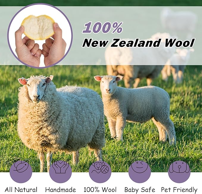 - 𝟏𝟎𝟎% 𝐍𝐄𝐖 𝐙𝐄𝐀𝐋𝐀𝐍𝐃 𝐖𝐎𝐎𝐋 - The 6-piece set of organic dryer balls is meticulously handcrafted from 100% natural New Zealand wool, free from any chemicals or fillers. They guarantee the health and safety of you, your family, and the environment, making them suitable for everyone to use.