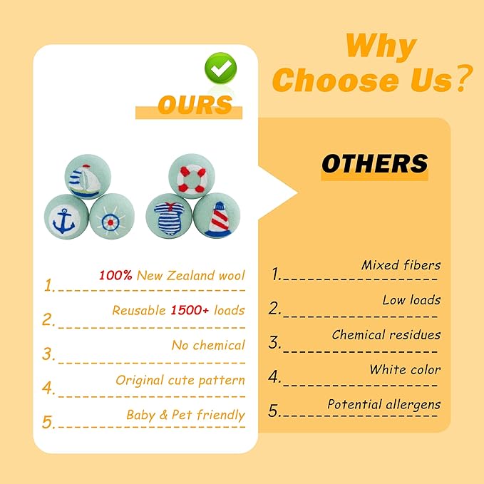 - 𝐄𝐗𝐂𝐄𝐋𝐋𝐄𝐍𝐓 𝐆𝐈𝐅𝐓 𝐎𝐏𝐓𝐈𝐎𝐍 - A set of 6 wool balls with nautical pattern is the perfect eco-friendly gift for any occasion, you can give it to an eco-conscious family member, and bring them joy and efficiency with these cute and reusable drying balls, making every laundry day a fun day for them.