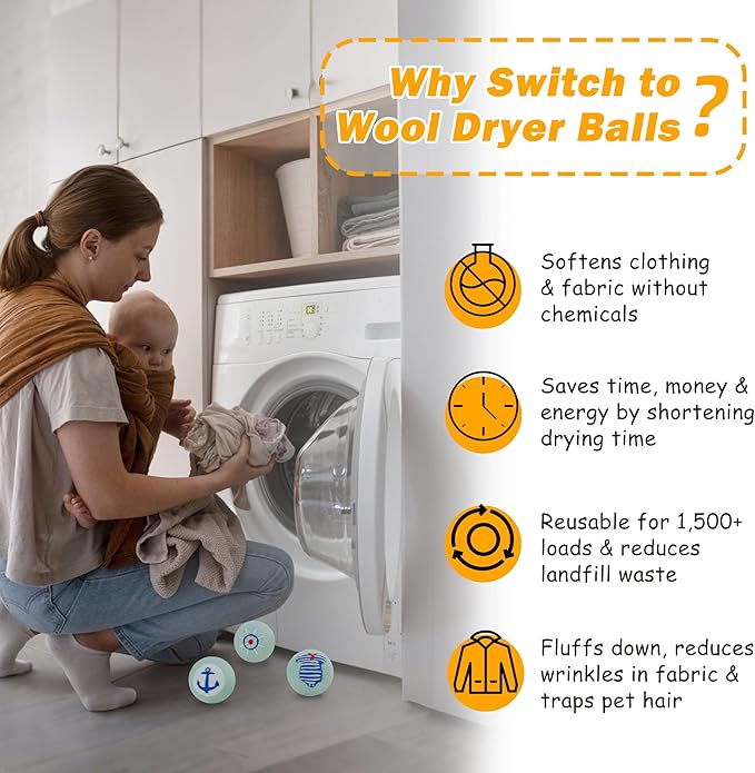 - 𝐒𝐎𝐅𝐓𝐄𝐍 𝐂𝐋𝐎𝐓𝐇𝐈𝐍𝐆 & 𝐑𝐄𝐃𝐔𝐂𝐄 𝐒𝐓𝐀𝐓𝐈𝐂 - Wool has natural anti-static properties, instead of liquid softeners containing chemicals, wool balls for dryer can make your clothes softer and fluffier, reduce wrinkles and static electricity attraction. At the same time, these cute laundry balls for dryer effectively prevent pet hair from getting into your clothes, so you can enjoy clean, static-free clothes, which is actually suitable for families with pets.