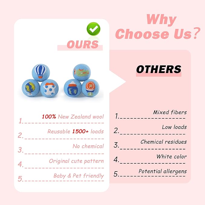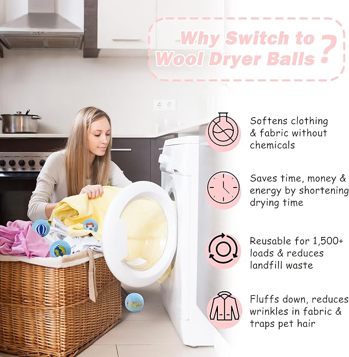 - 𝐒𝐎𝐅𝐓𝐄𝐍 𝐂𝐋𝐎𝐓𝐇𝐈𝐍𝐆 & 𝐑𝐄𝐃𝐔𝐂𝐄 𝐒𝐓𝐀𝐓𝐈𝐂 - Wool has natural anti-static properties, instead of liquid softeners containing chemicals, wool balls for dryer can make your clothes softer and fluffier, reduce wrinkles and static electricity attraction. At the same time, these cute laundry balls for dryer effectively prevent pet hair from getting into your clothes, so you can enjoy clean, static-free clothes, which is actually suitable for families with pets.
