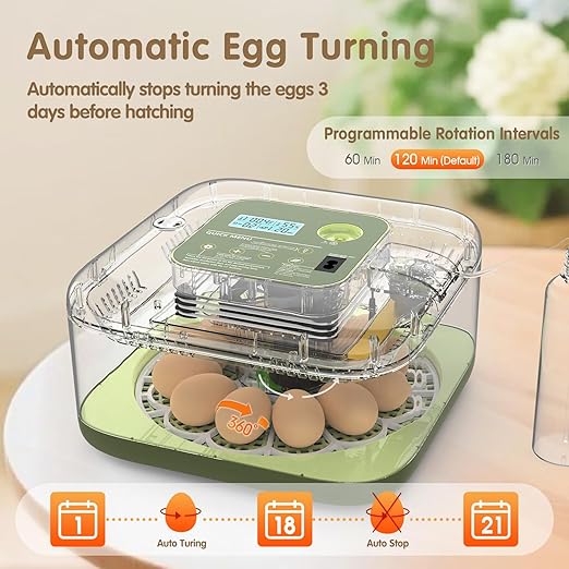 - 【Smart Auto Egg Turner】This automatic egg incubator for chicken, quail, duck, and goose eggs gently rotates eggs every 60/120/180 minutes to mimic natural hen behavior. Turning automatically stops 3–4 days before hatching, improving hatch rates and protecting embryos