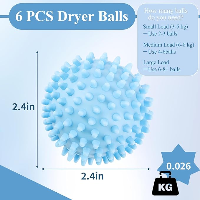 - Multifunctional Use: Package includes 6 dryer balls with a diameter of 2.4 inches to soften clothes, remove hair and lint, and keep fabrics fresh, soft and odor-free