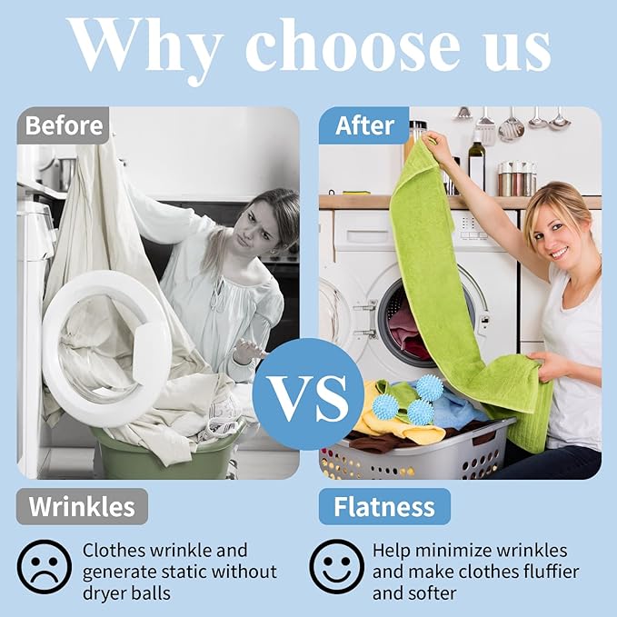- Reduce Ruffles: These dryer balls help reduce wrinkles, twists and tangles by massaging the fabric, leaving clothes fluffier and softer without the use of chemical softeners