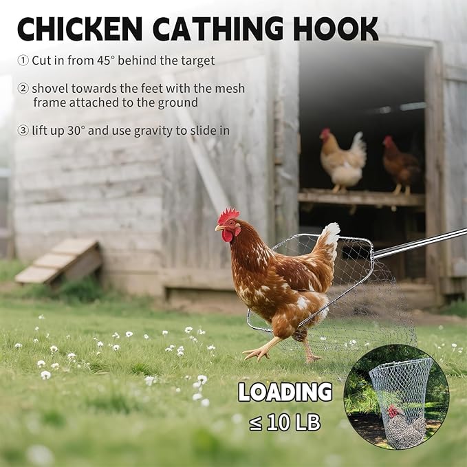 - 【Multi-scene Capture System】The gray hard catching net (poultry pecking prevention), suitable for capturing adult poultry, can load 10LB;the orange one, can reduce stress in poultry, is suitable for catching small chickens and animals, especially at night, which not exceeding 3.3LB;For narrow spaces, use hooks to hook the legs of animals, limit their movement after easy capture will be a better choice