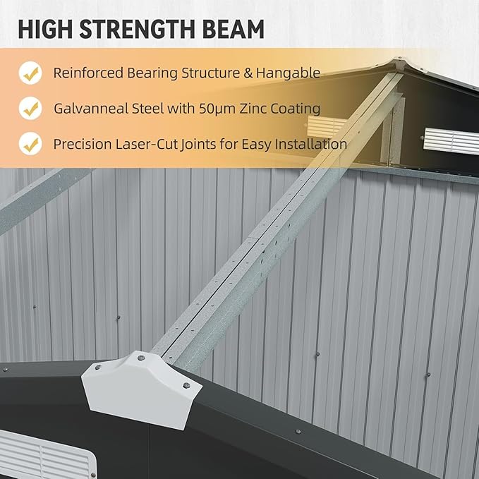 - Premium Floor Frame and Galvanized Steel Build:This metal shed is constructed using thick galvanized steel panels , offering outstanding durability. Its anti-rust powder-coated surface, paired with a 15mm interlocking plastic floor featuring a woodgrain texture, guarantees 360° moisture resistance while preserving the floor's evenness. Moreover, the floor can support a load-bearing capacity of 82 pounds per cubic foot, enabling it to effortlessly accommodate heavy machinery.