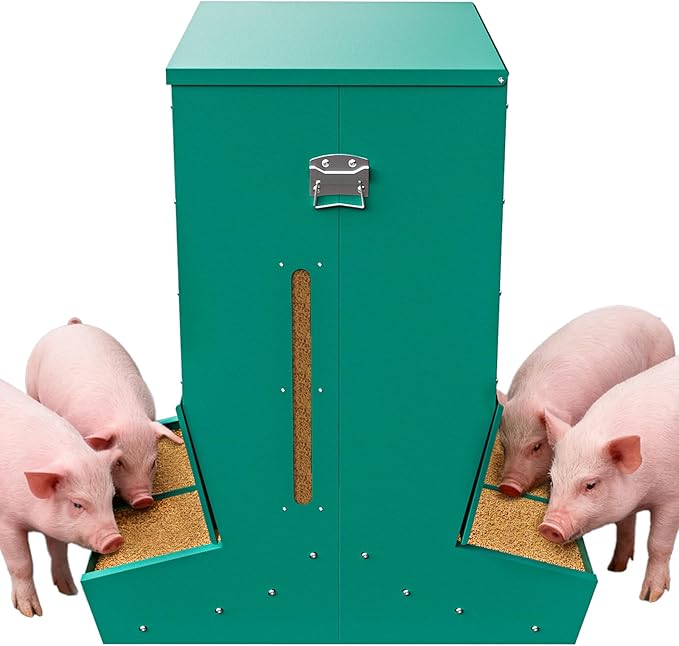 - SMART DESIGN - This hog feeder with rolled edge design which avoid scratching pigs when feeding and ensure safety, Side visable windows for allowing observation of feed quantity and adding feed easily when there is not enough feed available. The locked buckle design - Fixed the baffle when feeding, It can be locked when not in use.