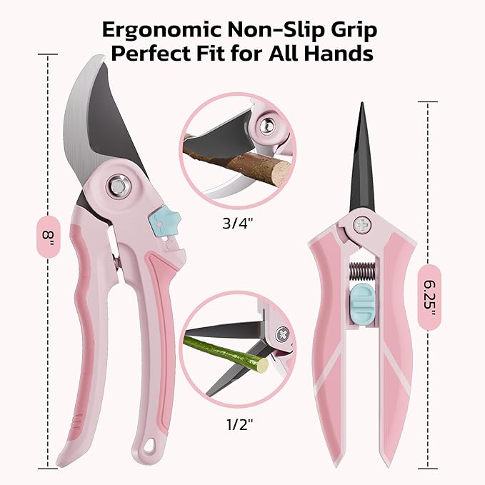 - 【Ergonomic & Versatile】Lightweight hand pruners with non-slip handles and high-tension springs reduce hand fatigue. Whether you need pruning shears for gardening, plant shears for fruit trees, or tijeras de jardinera for flowers, this set has you covered.