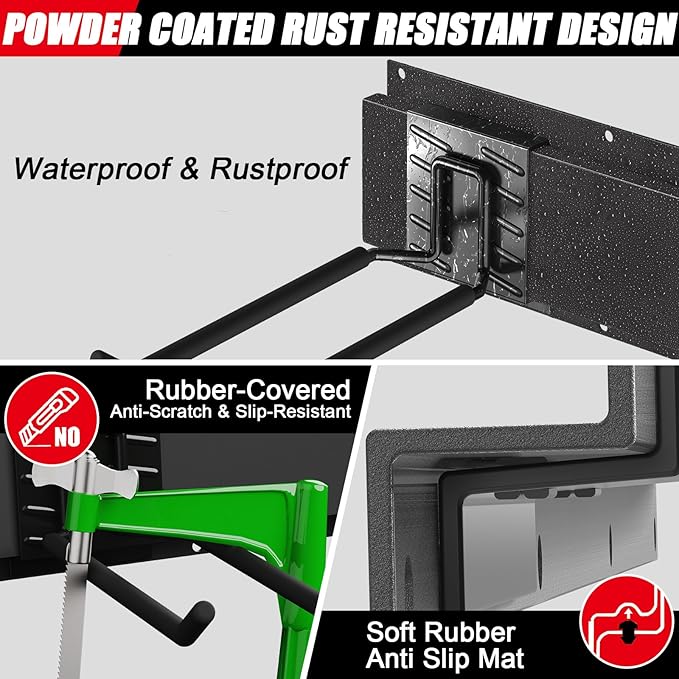 - Heavy Duty & Sturdy: Crafted from premium quality, heavy-duty alloy steel materials, our tool rack boasts an impressive 660 lbs weight capacity – strong enough to hold even your heaviest equipment. The double powder-coated finish resists rust, scratches, while rubber-coated hook arms prevent slipping and protect tool surfaces from dents, long-lasting and sturdy.